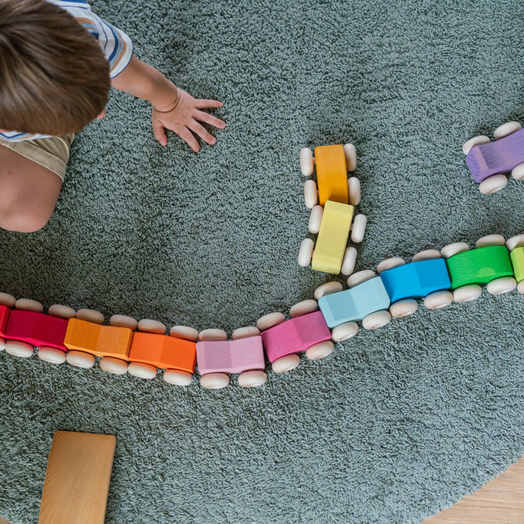 Unsere Stapel-Autos verbinden zwei große Themen des kindlichen Spielens: Sie lassen sich aufeinander stapeln und sie können rollen. Außerdem können sie auch mit anderen Elementen bebaut werden und diese dann transportieren. Durch die unterschiedlichen Farbpaare und Formvarianten werden kleine Kinder bereits an Farbharmonien und das Prinzip von Stück und passendem Gegenstück herangeführt.